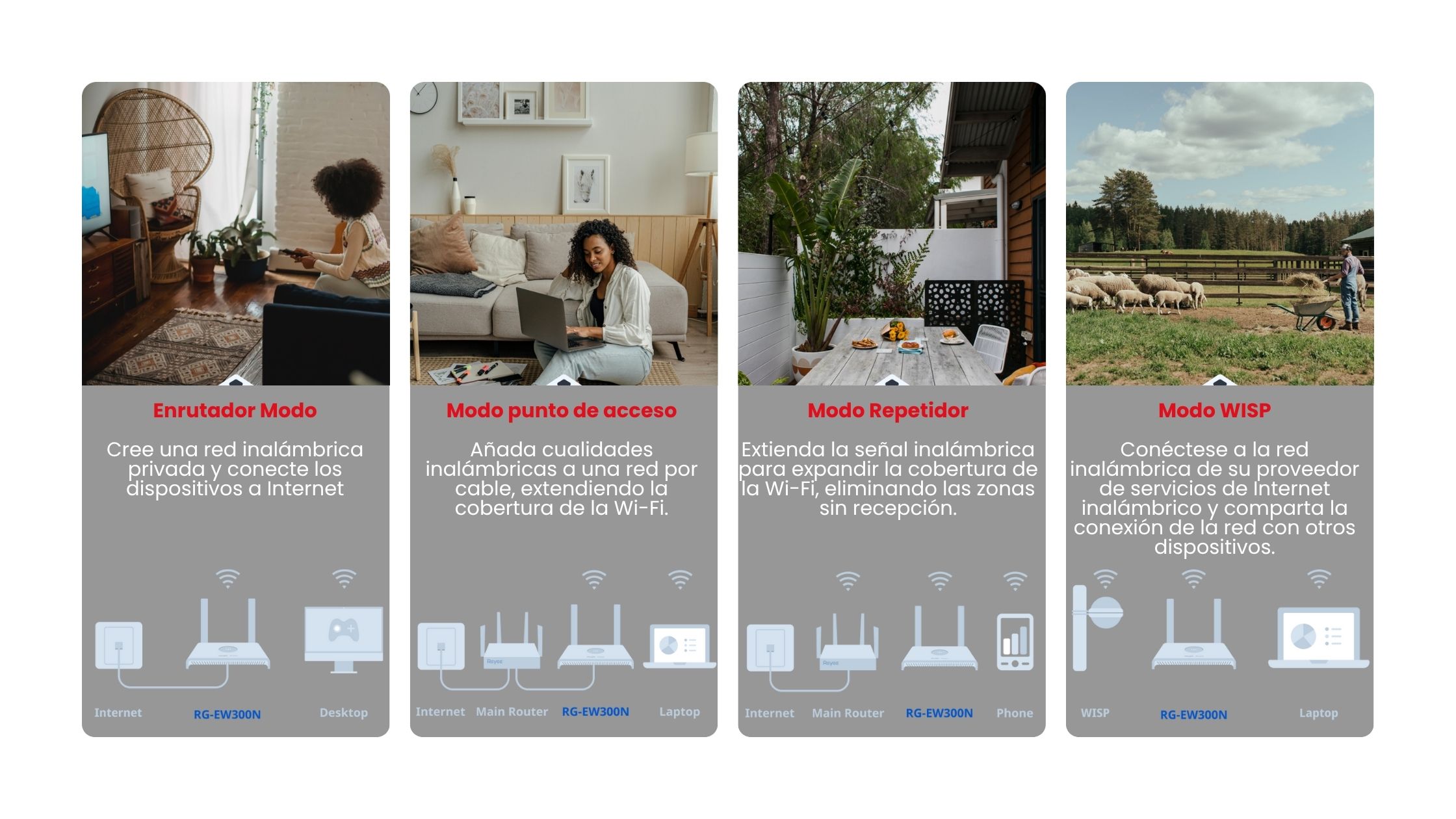 • Admite cuatro modos: modo enrutador, modo repetidor, modo punto de acceso y modo proveedor de servicios de Internet inalámbrico WISP.